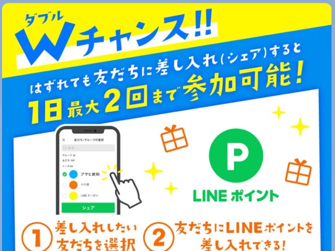 友だちにシェアすることでWチャンスに参加できるため、ユーザーからの二次拡散が見込める。通常のLINEキャンペーンよりも拡散性が高い設計である。