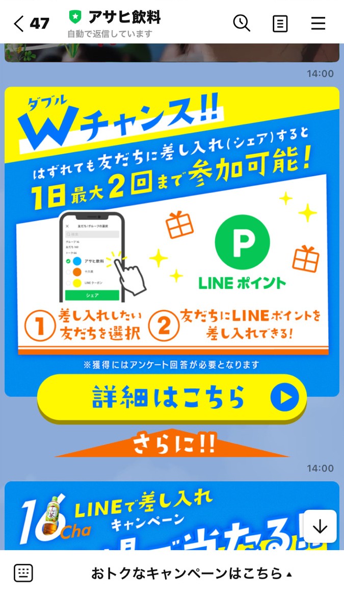 友だちにシェアすることでWチャンスに参加できるため、ユーザーからの二次拡散が見込める。通常のLINEキャンペーンよりも拡散性が高い設計である。