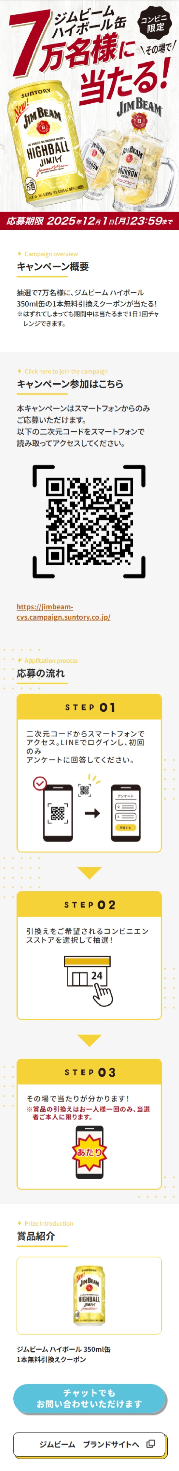 景品がジムビームハイボール缶という「今すぐ飲める体験」に直結する内容である点が魅力だ。当選7万名という当選枠の厚さが現実的な期待値につながり、参加の後押しになっている。高額一点狙いではなく、体験者を広く生む設計として、ブランド理解の裾野を広げやすい。
