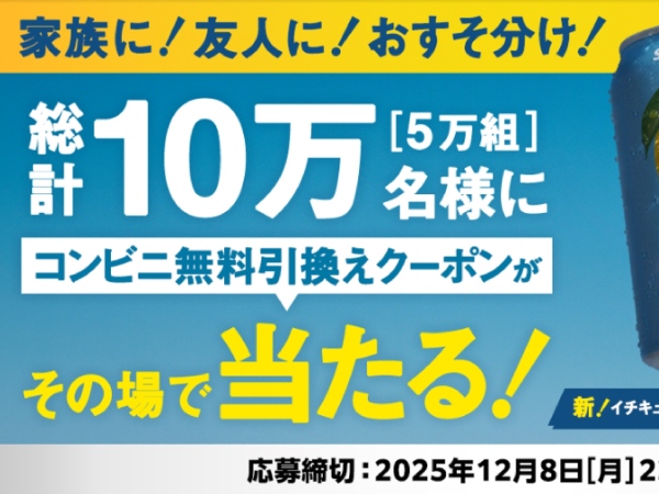 家族に!友人に!おすそ分け!総計10万[5万組]名様にコンビニ無料引換えクーポンがその場で当たる!