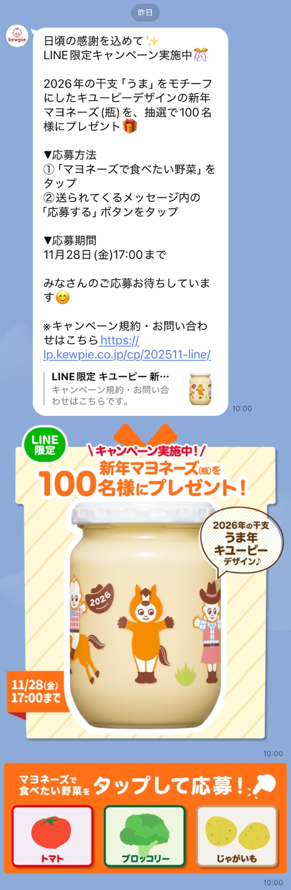 通常の友だち登録をフックにしたインセンティブプレゼント型キャンペーンと比べると、応募ハードルはやや高い。ただし、「マヨネーズで食べたい野菜を選ぶ」というゲーム性のある設計により、参加体験としての楽しさが担保されており、参加の後押しとしては比較的強い施策だと感じる。