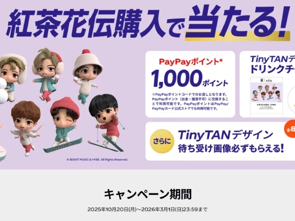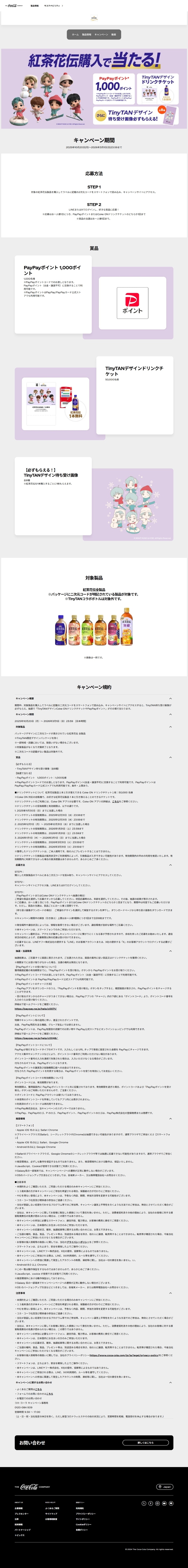 必ずもらえるTinyTANデザイン待ち受け画像全8種に加え、PayPayポイント1,000pt(1,000名)とCoke ONドリンクチケット(50,000名)を用意した景品設計は、幅広い層に刺さる構成だ。金銭的価値と実体験価値を両立しており、当選期待値も十分高い。特にドリンクチケットは商品トライアルに直結し、「当たって終わり」にならない点が秀逸である。