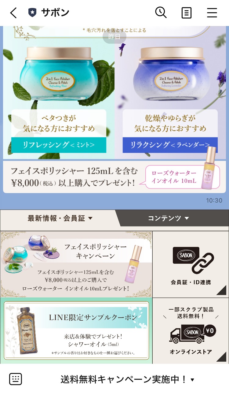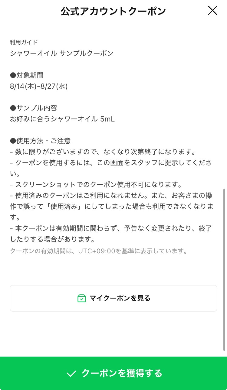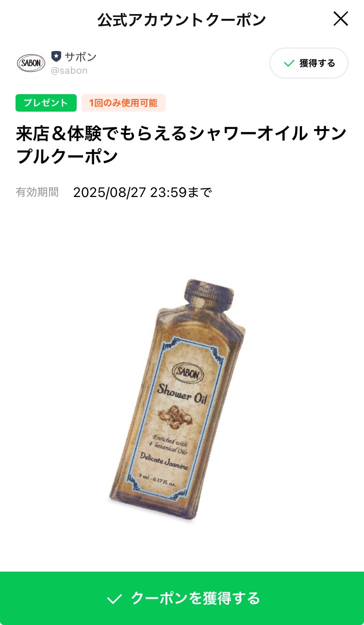LINE限定サンプルクーポン来店&体験でプレゼント!シャワーオイル(5ml)