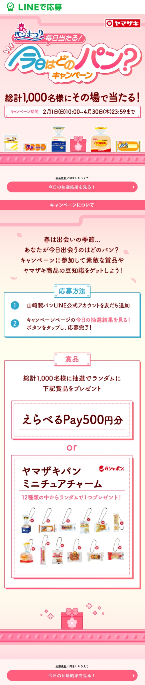 「今日はどのパン?」というコピーと毎日参加型の仕組みは親しみやすく一定の話題性あり。ただしSNSシェア導線が弱く、UGC創出力は低めで自然拡散にはやや欠ける設計。